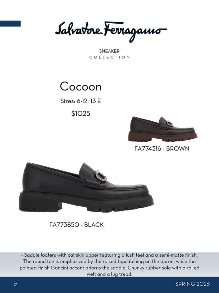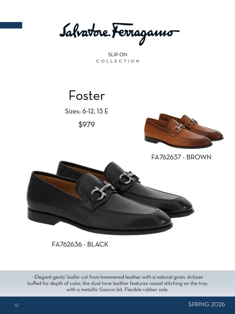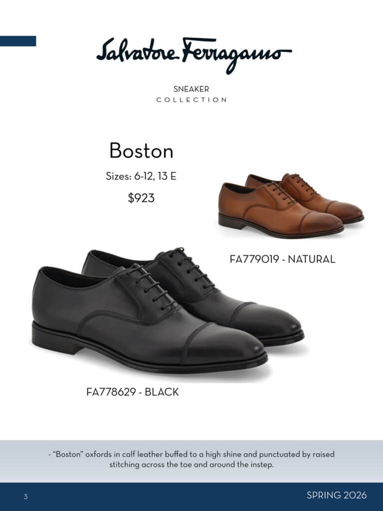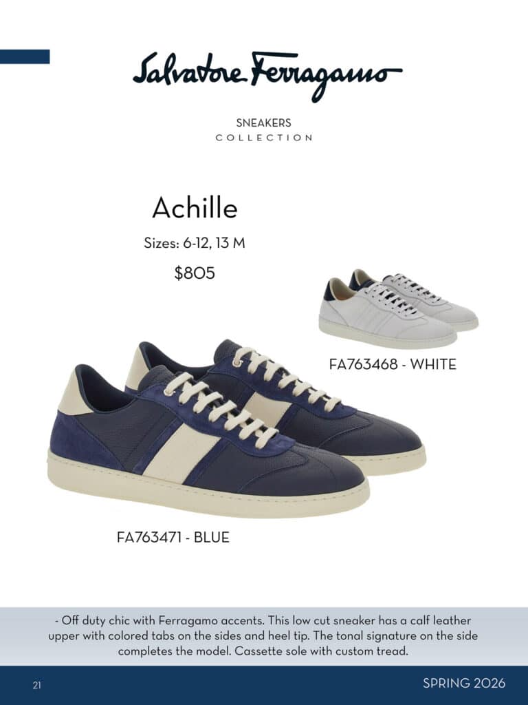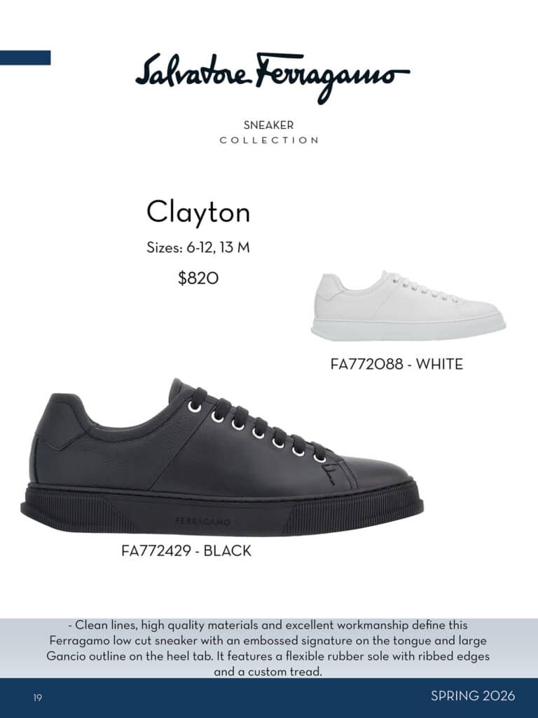 With over 100 choices, his customers will find everything from dress shoes to sneakers amongst other styles that are refreshed seasonally. In fall, he offers a range of boots and brings in textured leathers and suedes. For spring the collection gets more relaxed with the addition of moccasins, sandals and drivers and the newest sneakers.