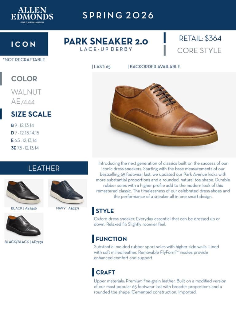 With proper care, Allen Edmonds shoes can last for decades so you can stop buying throw-away shoes every year. Our Goodyear welted and handsewn shoes are made so well they are available for our legendary Recrafting® service where we rebuild the shoe from the bottom up to extend the life of your favorite shoes.